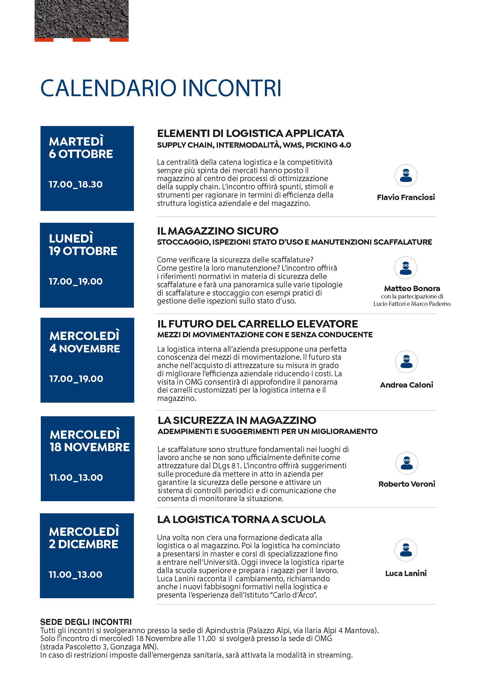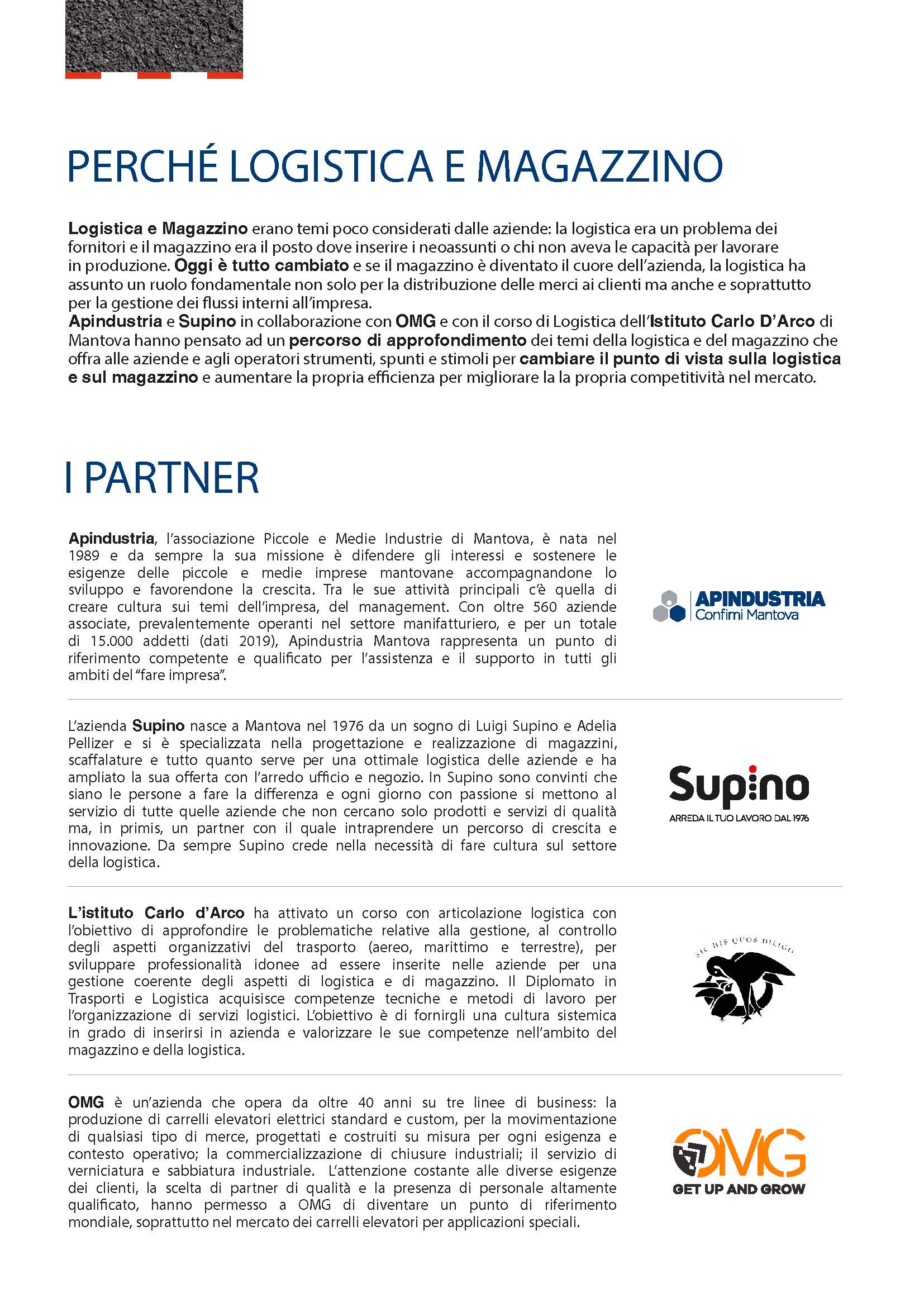 Logistica e Magazzino erano temi poco considerati dalle aziende: la logistica era un problema dei fornitori e il magazzino era il posto dove inserire i neoassunti o chi non aveva le capacità per lavorare in produzione. Oggi è tutto cambiato e se il magazzino è diventato il cuore dell’azienda, la logistica ha assunto un ruolo fondamentale non solo per la distribuzione delle merci ai clienti ma anche e soprattutto per la gestione dei flussi interni all’impresa.Apindustria e Supino in collaborazione con OMG e con il corso di Logistica dell’Istituto Carlo D’Arco di Mantova hanno pensato ad un percorso di approfondimento dei temi della logistica e del magazzino che offra alle aziende e agli operatori strumenti, spunti e stimoli per cambiare il punto di vista sulla logistica e sul magazzino e aumentare la propria efficienza per migliorare la la propria competitività nel mercato.