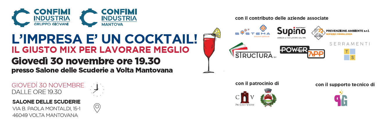 Gentili aziende associate, siamo lieti di invitarvi alla Cena d’inverno di Confimi Giovani Mantova che si terrà Giovedì 30 novembre: cocktail, impresa e marketing.